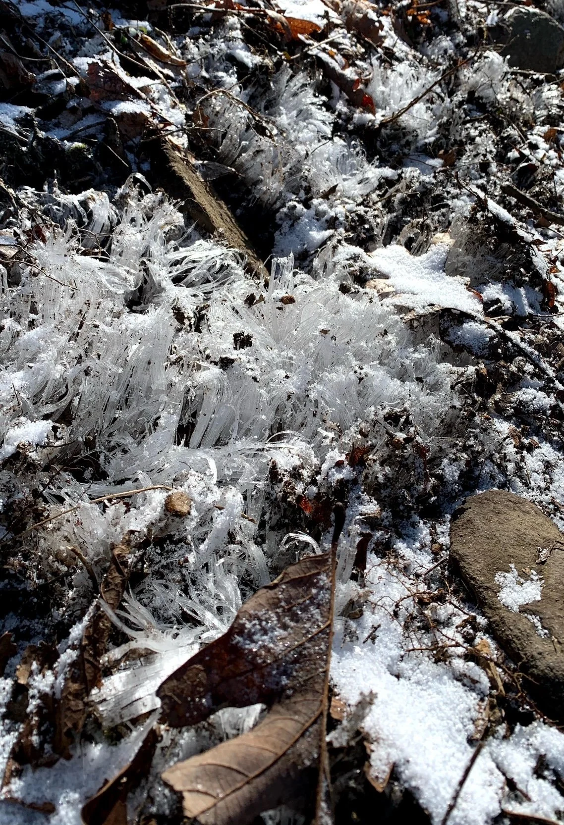 One chilly morning, Laurie and her husband Dennis dropped off her brother- and sister-in-law at the start of the Appalachian Trail. “We joined them for a mile or two,” she says. “The frost the night before forced needle-shaped ice from the clay soil along the path. I’d never seen such a thing! More wonders!”