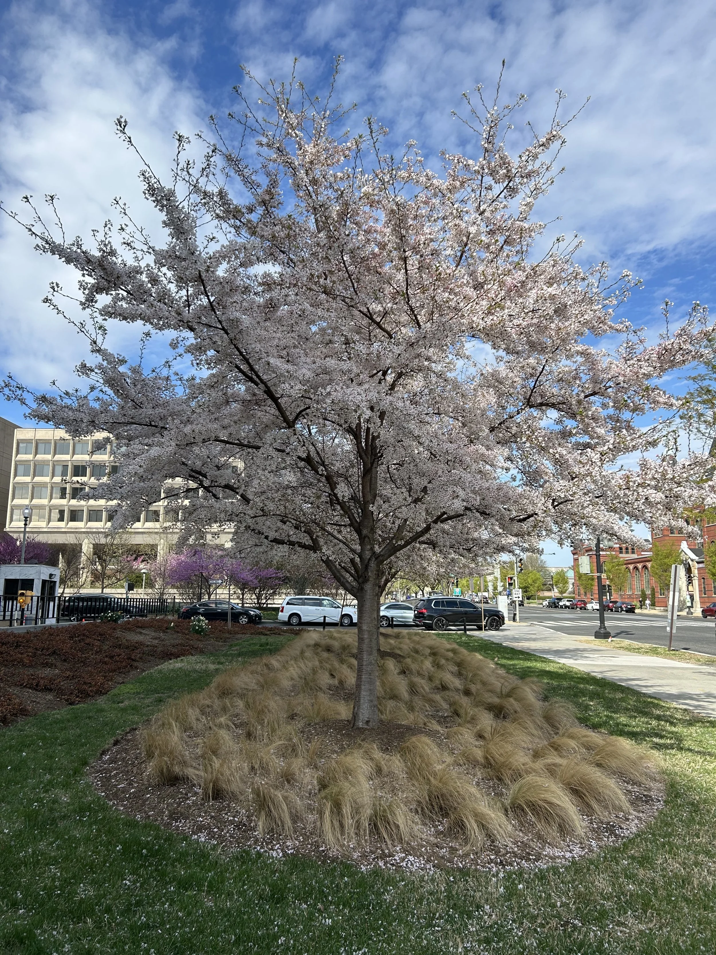 Pink petals littered the ground beneath a row of cherry trees that were covered with the full pink blooms that make them famous.