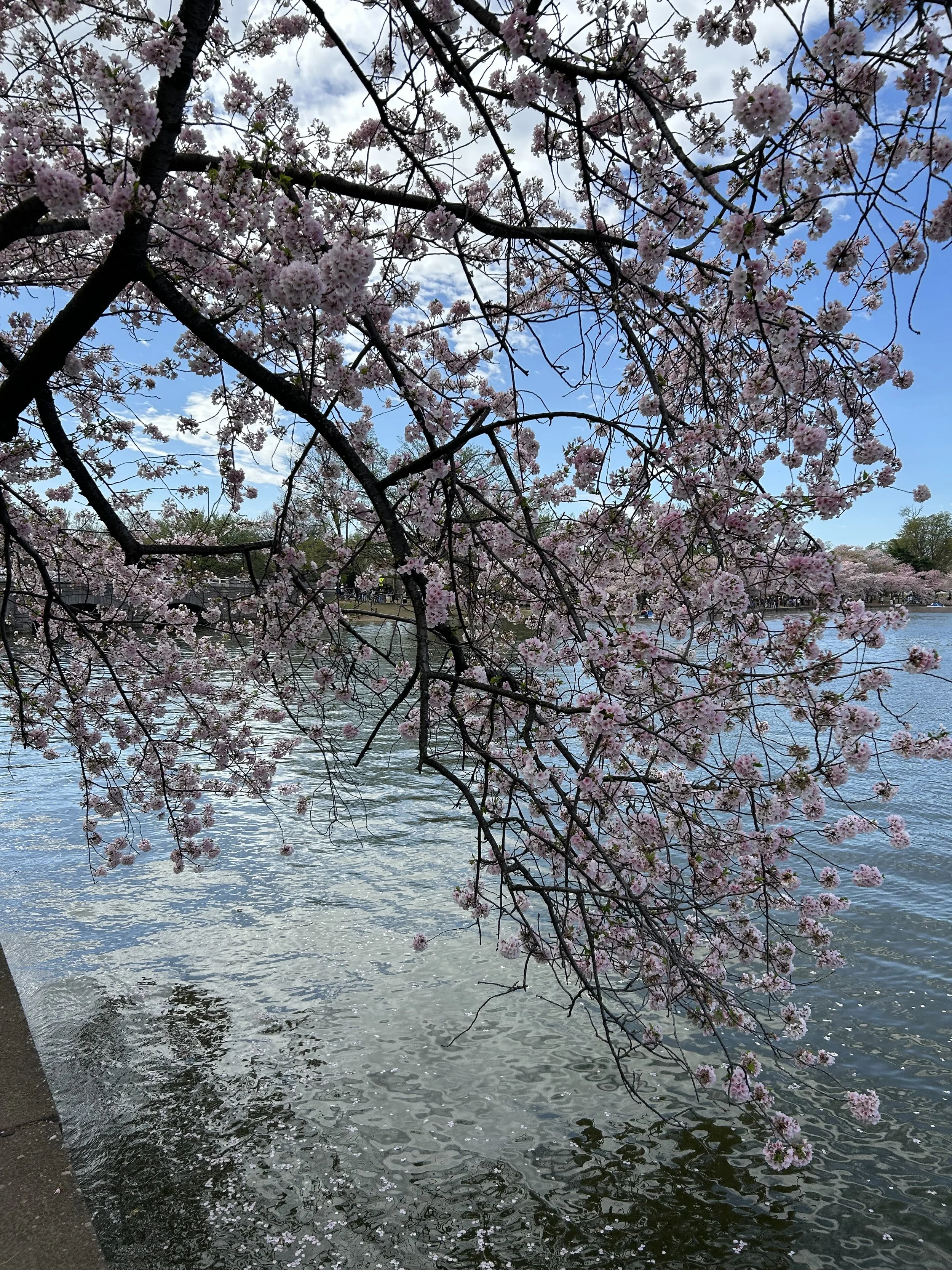 Next, we crossed another smaller street and came to the Tidal Basin. Here and all along the water in the Floral Park, fellow admirers stood gazing at the trees and taking photos underneath with the water as a background. Women and little girls wore white and pink dresses, ready for photo ops and perhaps a fancy celebration afterward. Their smiles added to the beauty of the scene.